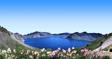 長白山形成于一千二百萬年前的地質(zhì)造山運動,期間,天池是巖漿噴發(fā)的錐管,經(jīng)過多次噴濺,拓成了巨型的傘面體,當(dāng)火山休眠時涌泉溢出,形成十余平方公里的浩瀚水面?!√斐叵娜凇⒊厮克{(lán);冬凍、冰面皓白;海拔2178.1米,平均深度204米,被十六座山峰環(huán)繞。在西景區(qū),要爬上1442個臺階才能看到天池,從這個方向看天池,視野開闊、氣勢宏偉,這里也是拍攝天池是落日最好的景點。每年七、八月間,生長在水岸、巖坡上的長白杜鵑、高山罌粟、高山菊,以及長白越桔、松毛翠等植被,都在短暫的時光里競相開放,五色斑斕,形成了奇幻的花海天池。