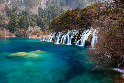 冰天雪地的九寨溝,一個(gè)個(gè)湛藍(lán)的海子如同一顆顆藍(lán)寶石在閃閃發(fā)光。九寨溝的冬天除了長(zhǎng)海外,其它海子都不結(jié)冰,但激流的瀑布此時(shí)卻都凍成了冰條,一條條動(dòng)感地懸掛著。上面是雪白的冰瀑,下面是湛藍(lán)的海子,四周是被大雪銀妝素裹的叢林,一切都是靜止地,像是連時(shí)間也停止在這一刻了,美得那么不真實(shí),讓人以為走進(jìn)了一幅畫(huà)里。